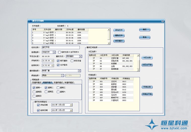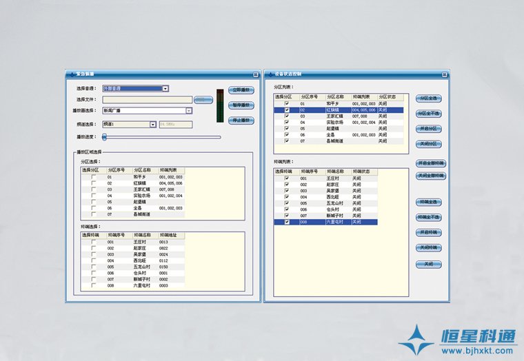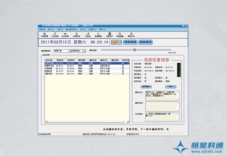 HX-6000智能廣播軟件是北京恒星科通科技發(fā)展有限公司開發(fā)的,擁有自主知識(shí)產(chǎn)權(quán)的新一代智能廣播系統(tǒng)。我公司自主開發(fā)播放引擎,一臺(tái)電腦可同時(shí)輸出1-6路音頻廣播節(jié)目,并可點(diǎn)對(duì)點(diǎn)尋址控制,該軟件已獲得國(guó)家知識(shí)產(chǎn)權(quán)局頒發(fā)的《計(jì)算機(jī)軟件著作權(quán)登記證書》。 該智能廣播軟件具有終端地址接收頻道可改寫,遠(yuǎn)程控制工作頻率和音量等功能。該系統(tǒng)還具有任意分區(qū)編組、尋址控制功能、多路播放、緊急廣播、外部設(shè)備定時(shí)開關(guān)、數(shù)據(jù)庫(kù)備份還原、自動(dòng)執(zhí)行播放任務(wù)、自動(dòng)開關(guān)機(jī)等多種功能。 該系統(tǒng)可應(yīng)用于農(nóng)村廣播、應(yīng)急廣播、校園廣播、工礦企業(yè)廣播和氣象災(zāi)害預(yù)警廣播等多種系統(tǒng)。